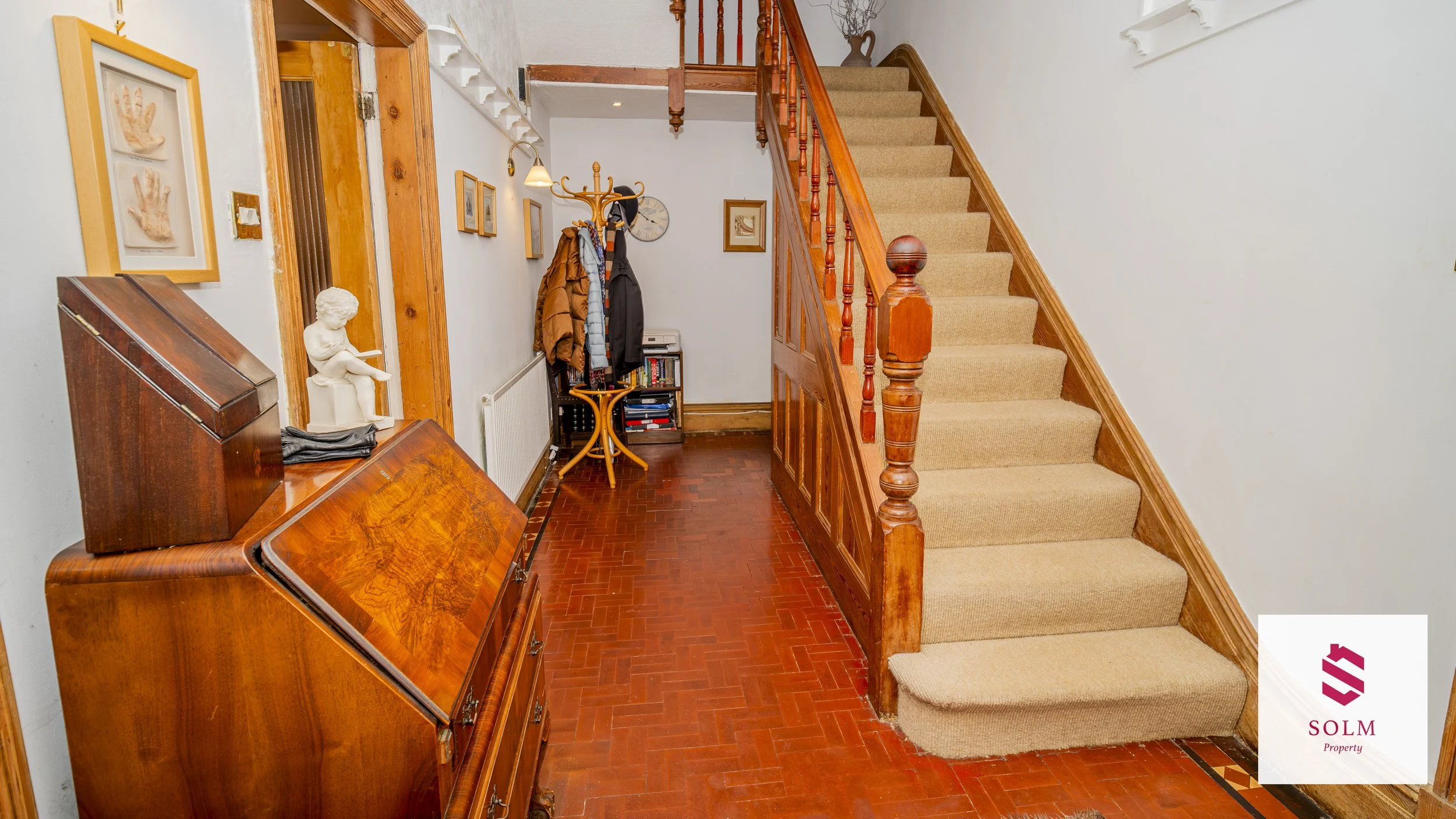 Reception Hall – An expansive and welcoming reception hall showcases herringbone-patterned quarry tiled flooring. Stairs with an oak banister ascend to the first-floor accommodation, with a storage cupboard positioned below. Within the hall, stripped pine internal doors provide access to the shower room, sitting room, dining room, and living room.