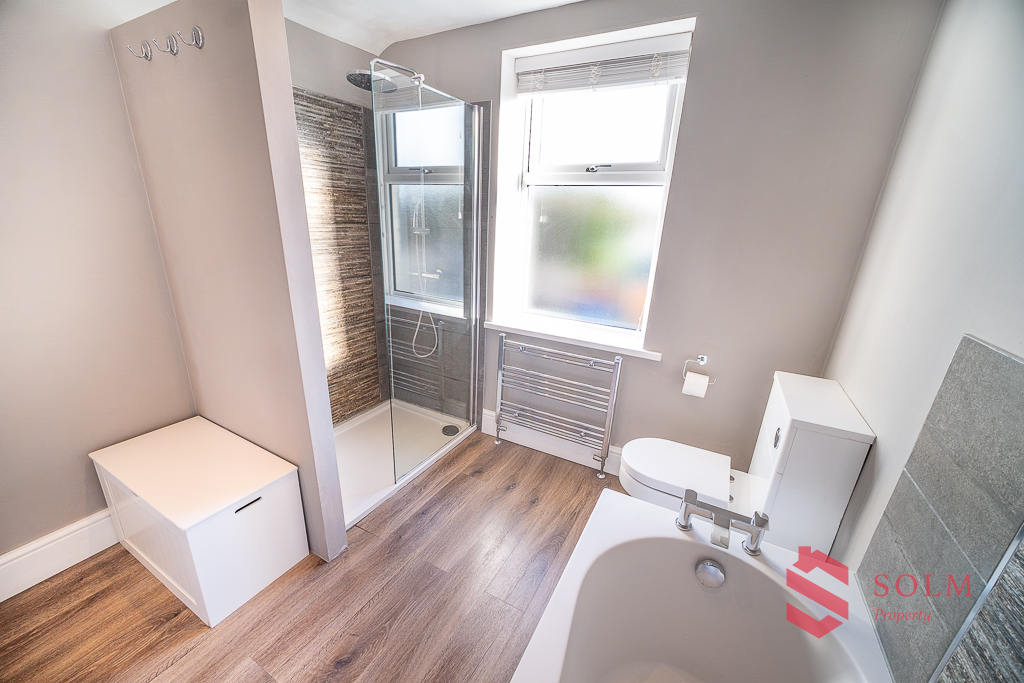 Part-tiled with wood-effect flooring, extractor fan and a contemporary four-piece suite including panelled bath, low-flush WC, vanity basin and walk-in shower with glass enclosure and thermostatic controls.