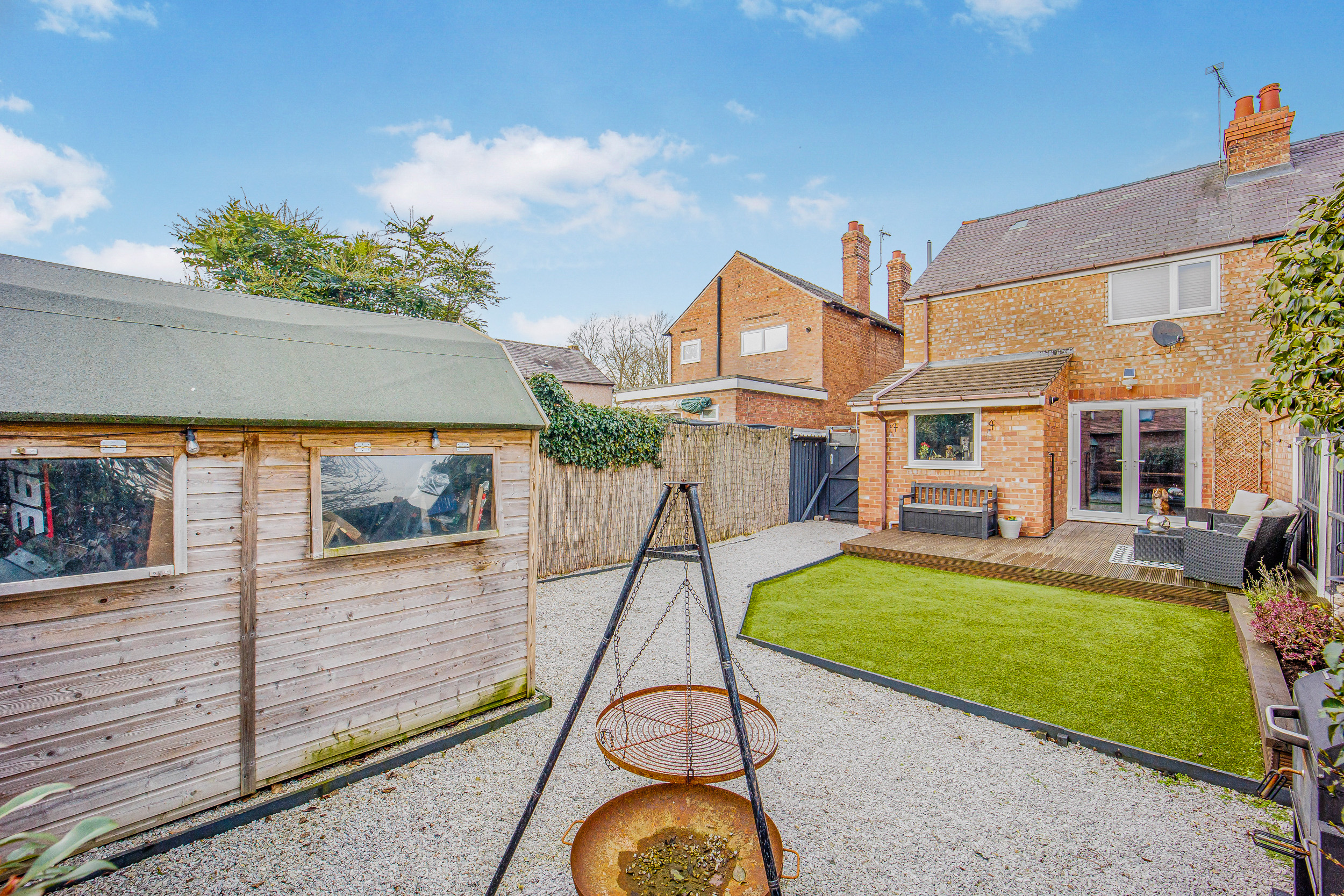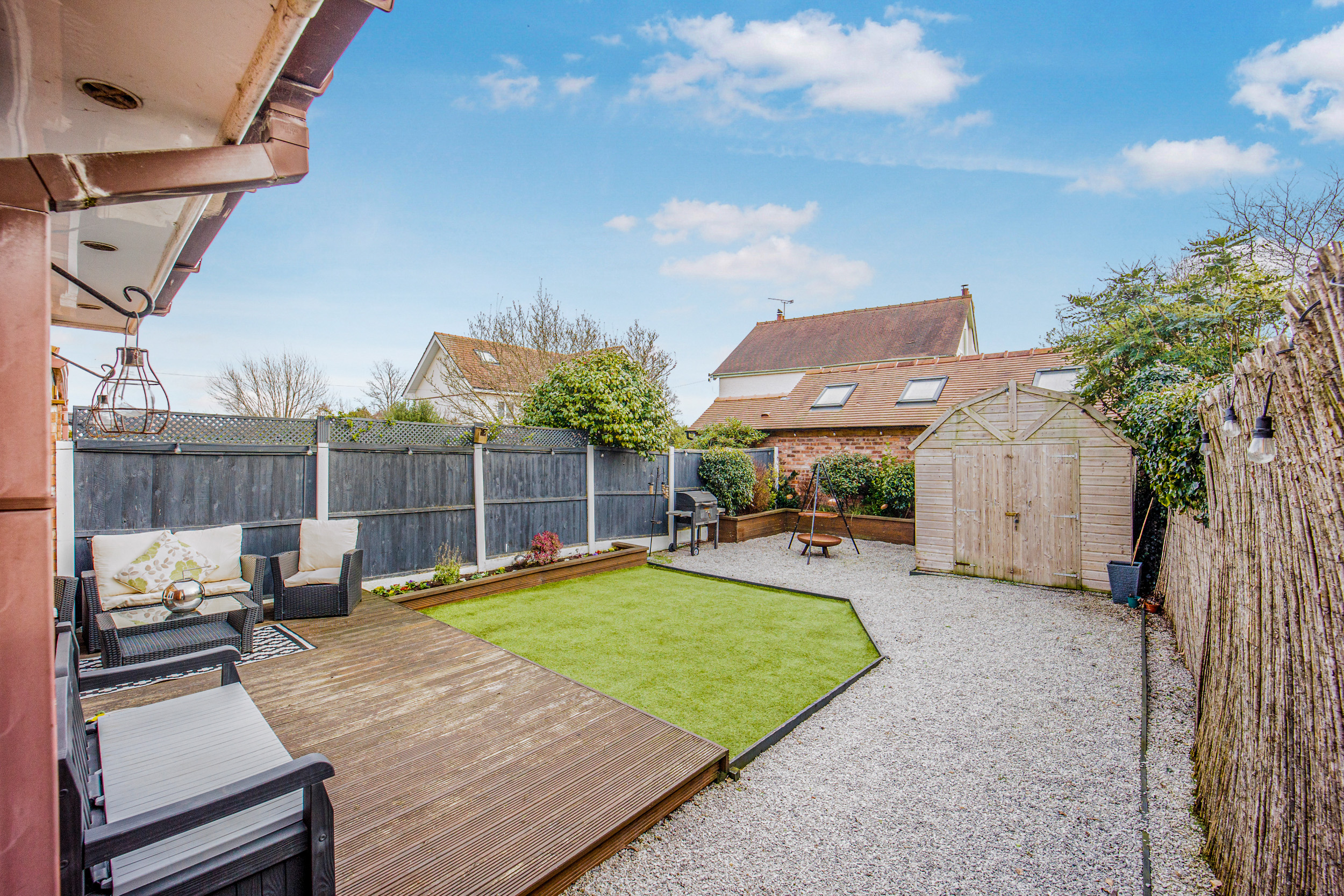 The dining space features an exposed brick fireplace and patio doors leading directly onto the south-facing, low-maintenance rear garden, which is private and not overlooked and ideal for summer evenings and relaxed weekend gatherings. A large double shed provides valuable additional storage or potential for alternative uses, subject to any necessary consents.