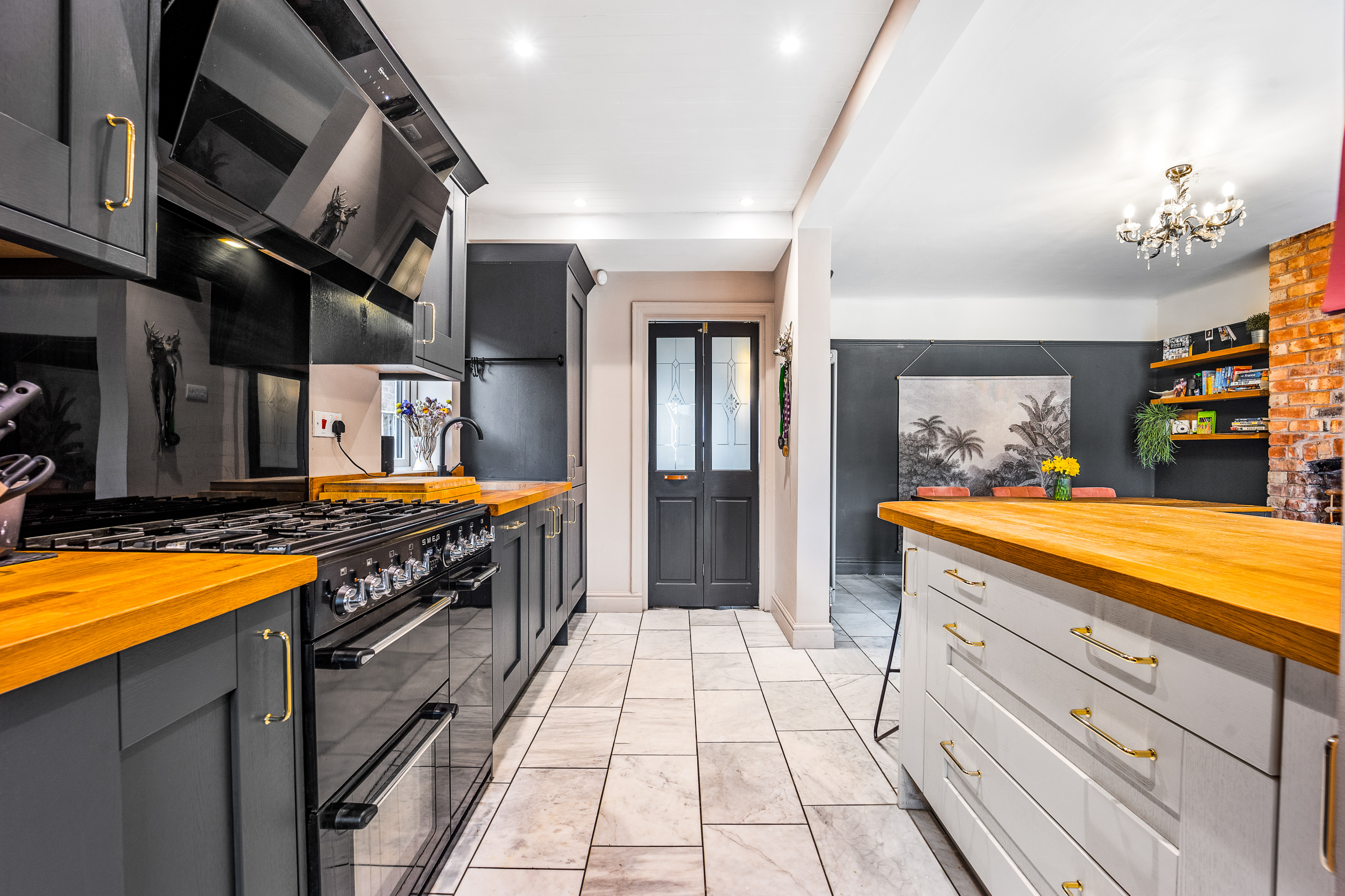 To the rear, the home opens into a stunning open-plan kitchen and dining area, thoughtfully designed for both entertaining and everyday family life. Marble flooring, solid wood worktops and a central island create a strong focal point, while twin Belfast sinks and a range of premium appliances including a SMEG five-ring range cooker, Neff extractor and Samsung appliances complete the space.