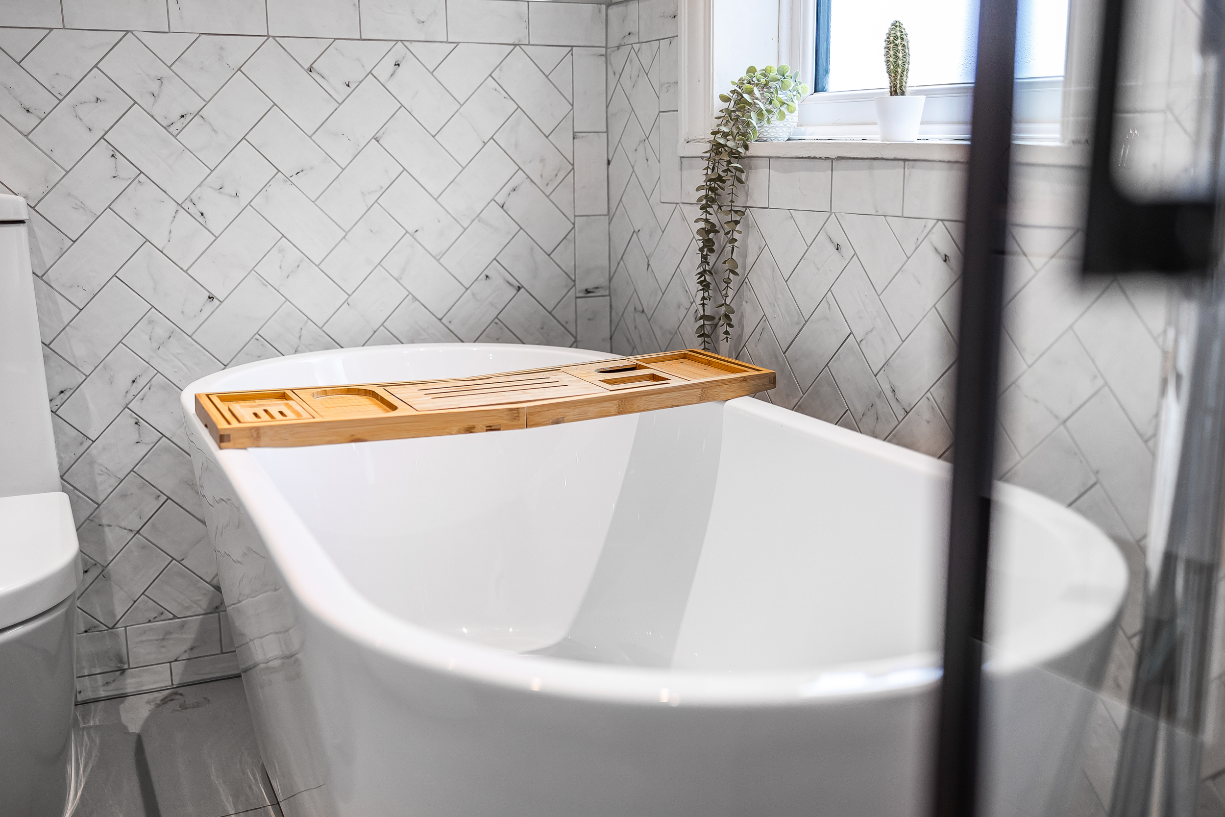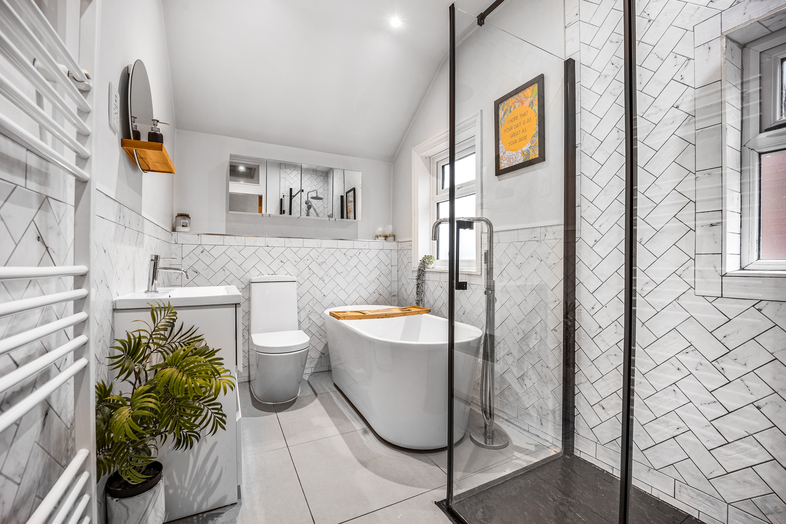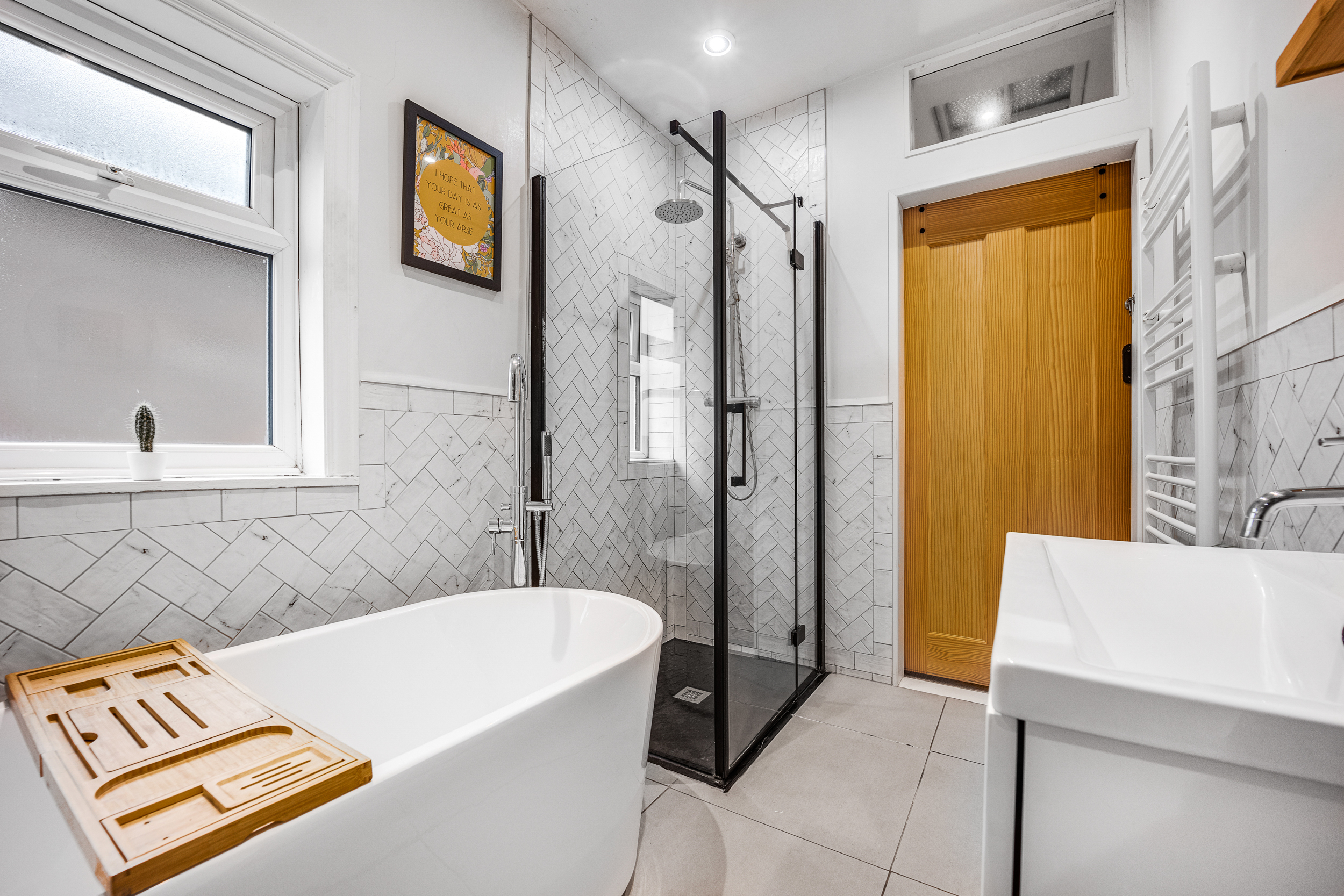 The bathroom is finished to a high standard, featuring a modern four-piece suite with walk-in shower and freestanding bath.