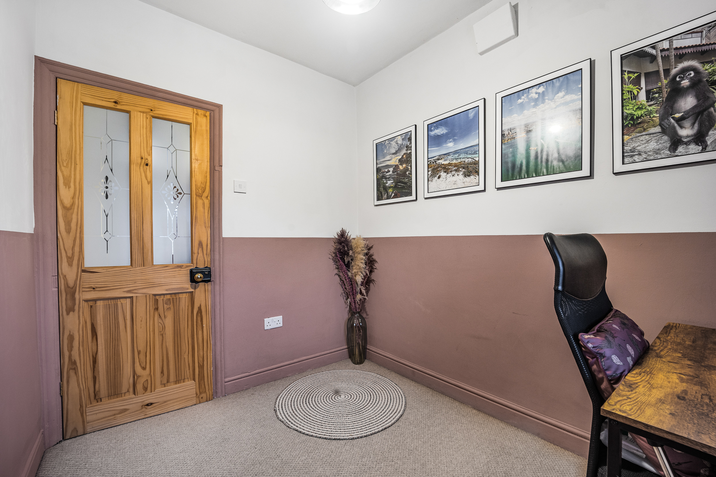 The front sitting room features solid wood flooring and a striking dual-fuel burner, providing a cosy yet elegant space to relax. A convenient downstairs WC sits just off the lounge.